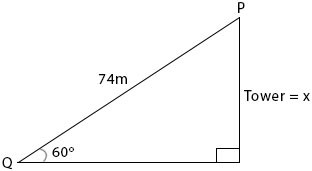 The angle of elevation of a point P on a tower from a point Q on the horizontal ground is 600. If /PQ/=74m, how high is P above the ground?