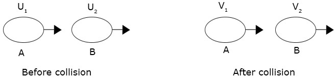 Case 1: Consider two bodies A and B of masses m1 and m2 moving in the same direction with velocities u1 and u2 respectively. After collision their velocities were V1 and V2 as shown below.